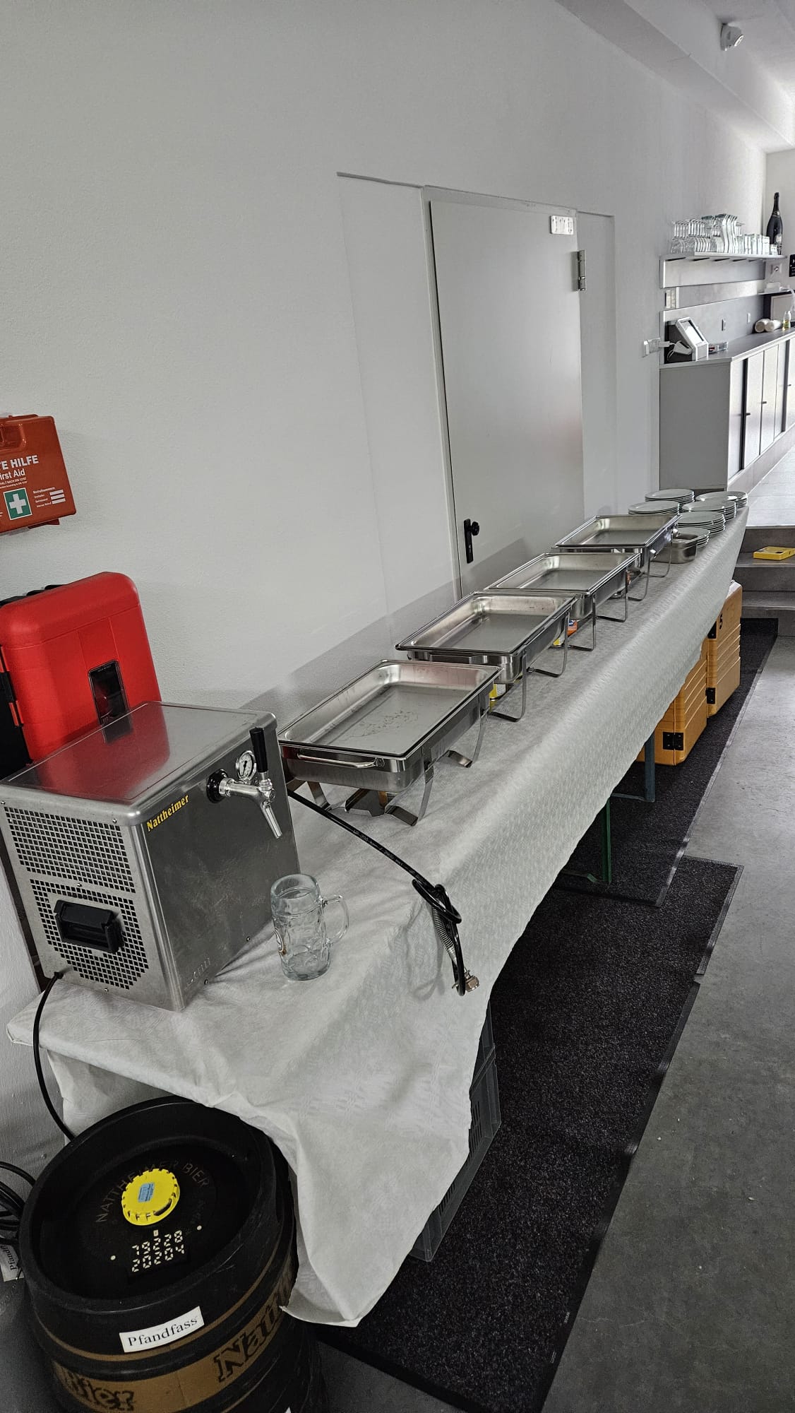 - Servicebereich mit Kaffeeautomat, große Kühlschränke, Mikrowellen, Kochplatte, gewerbliche Geschirrspülautomaten (120 Sec.) Gläser und Geschirr für 50 Personen vorhanden. (keine Küche im eigentlichen Sinne, eher für Catering gedacht)